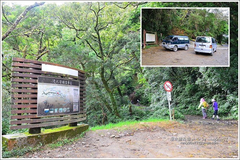 ↑浸水營古道入口。大漢林道23.5K處的古道入口前有一塊空地,我們在此下車整裝出發。右上小圖是接駁車。