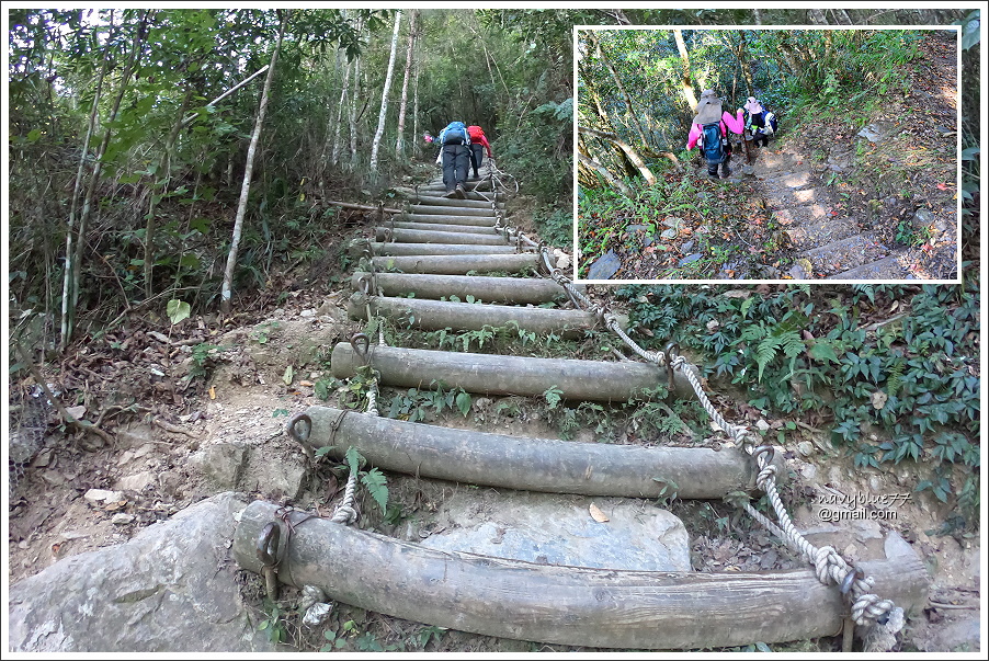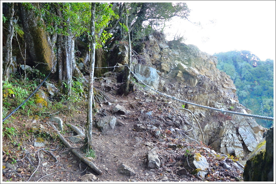 白石駐在所與馬鞍駐在所之間,因崩塌使得路況最差,高繞或下切路段坡度都很大,由西向東會先走右上小圖下切數十公尺,再爬大圖的70度陡繩梯,最後又高繞了一段才回到正途。