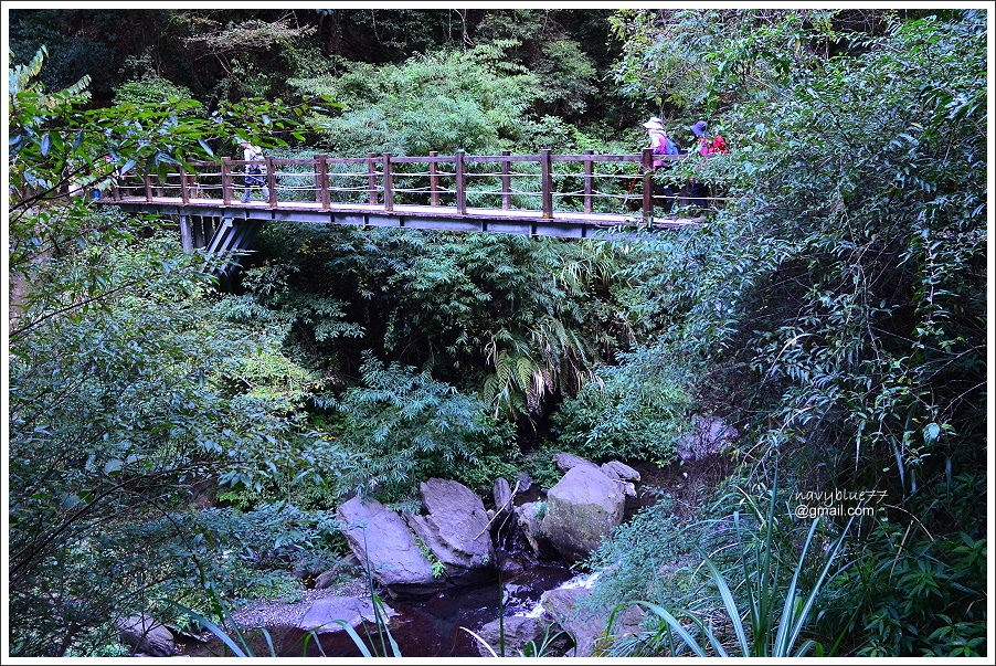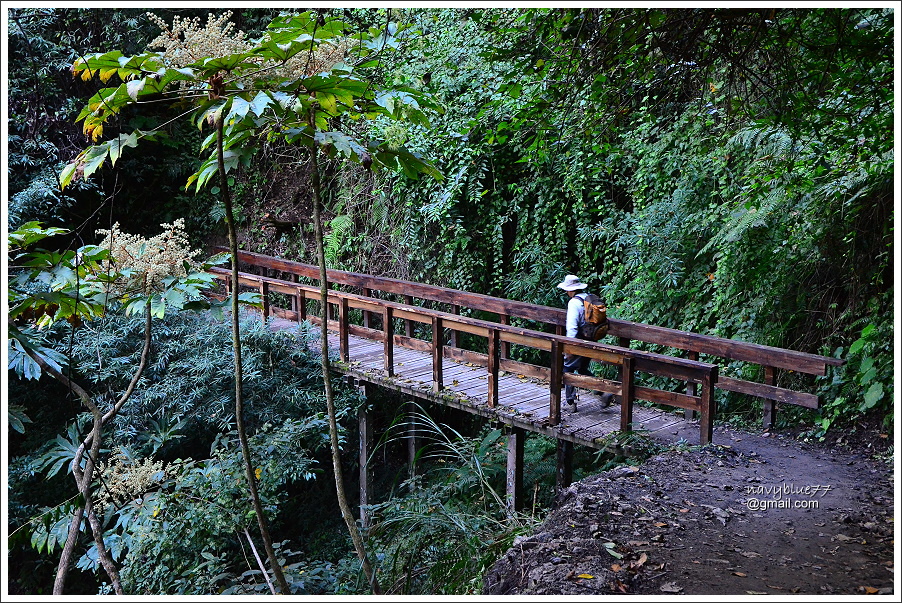 鐵拱木橋。過橋前望向對岸有一片楓香林的山坡上就是馬鞍駐在所。