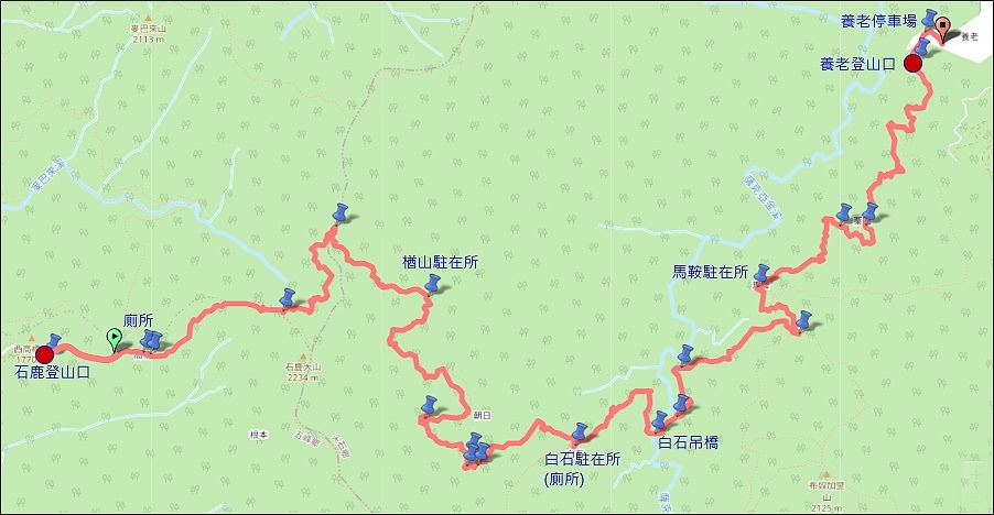 交通資料:由新竹五峰鄉清泉開始要先開約45分鐘清石林道才到石鹿登山口,路況不佳,需高底盤車輛才可順利通行。石鹿登山口無停車場。由尖石鄉往養老登山口的路況較佳,一般小車勉強可通行。登山口有停車場。因此若要走完全程,多安排接駁車,先載到石鹿登山口開走,接駁車再開3小時多到養老登山口接人。
