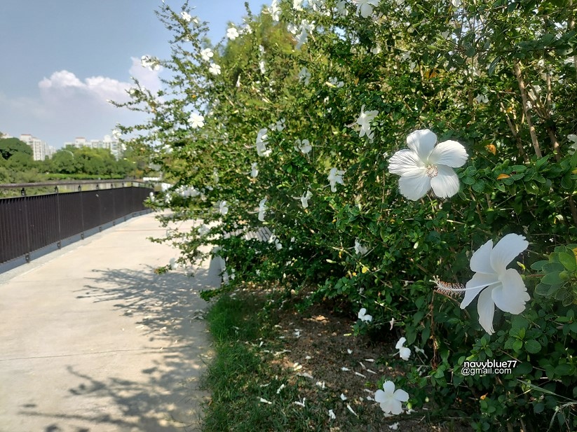 ↑竹溪水岸步道向南止於國民路,白色的扶桑花整叢盛開,煞是好看。