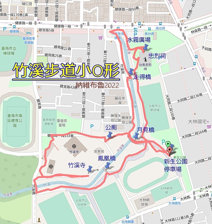 布魯便利貼 路線資訊: 交通資訊:於台南火車站(北站)搭乘0左路線公車至竹溪寺(健康路)站下車。自行開車者,可直接導航到忠烈祠或竹溪禪寺,週邊有多座停車場,請參見下圖。 |