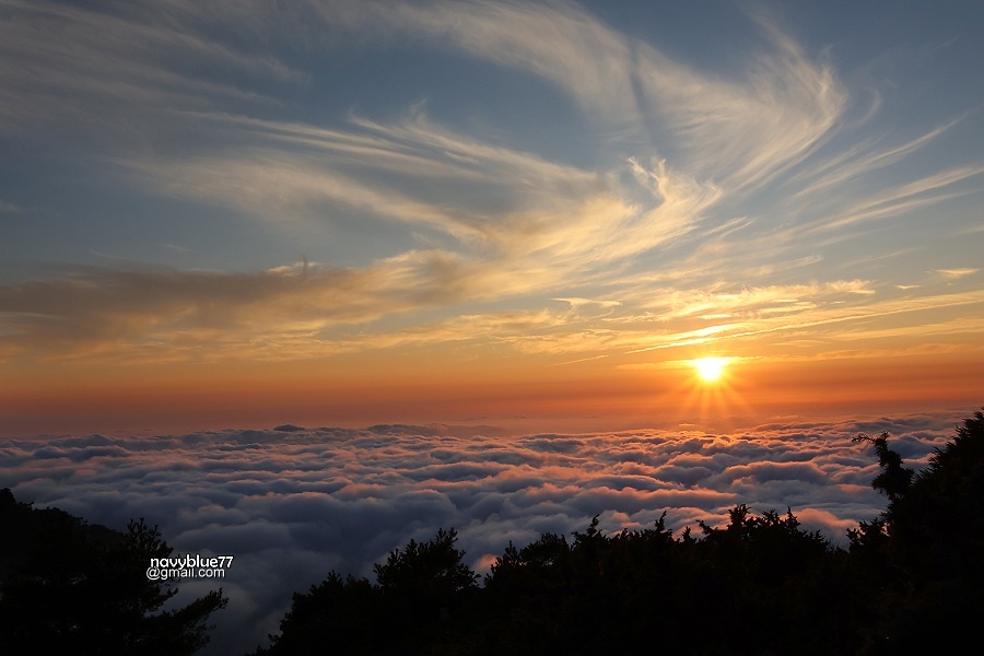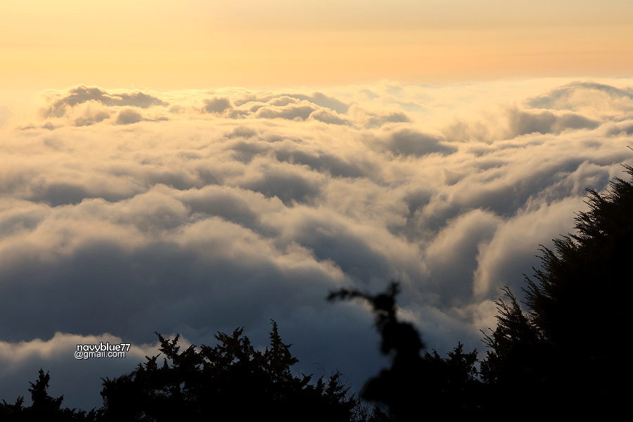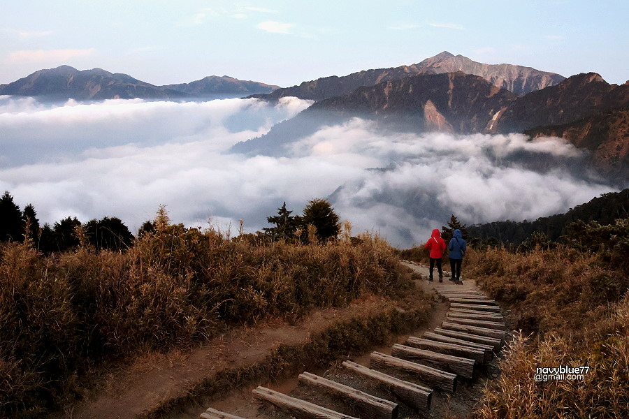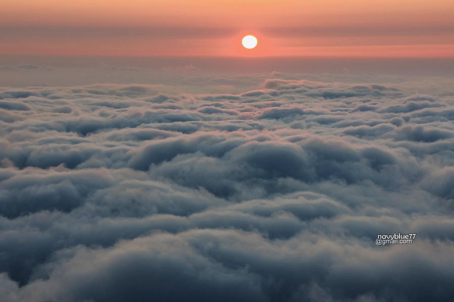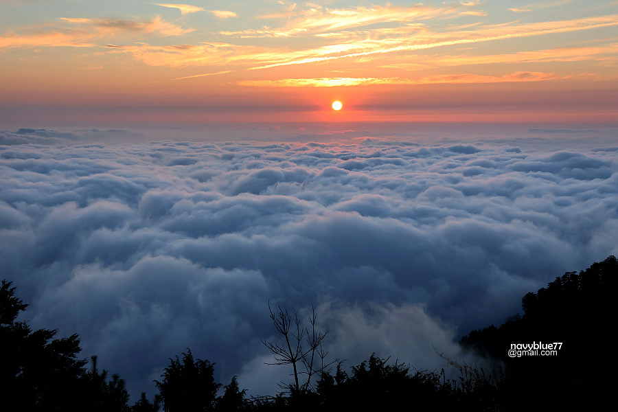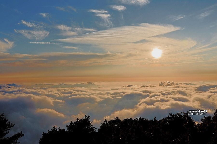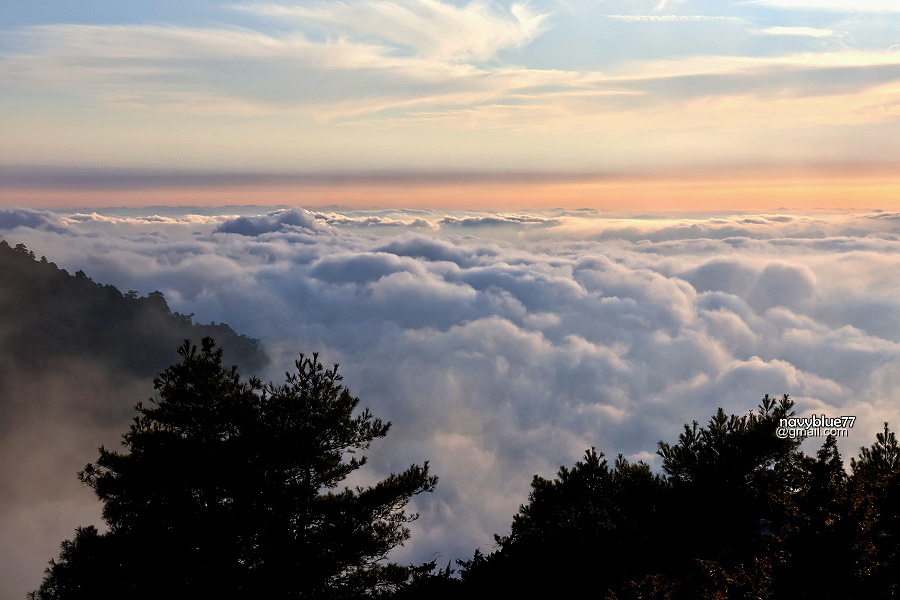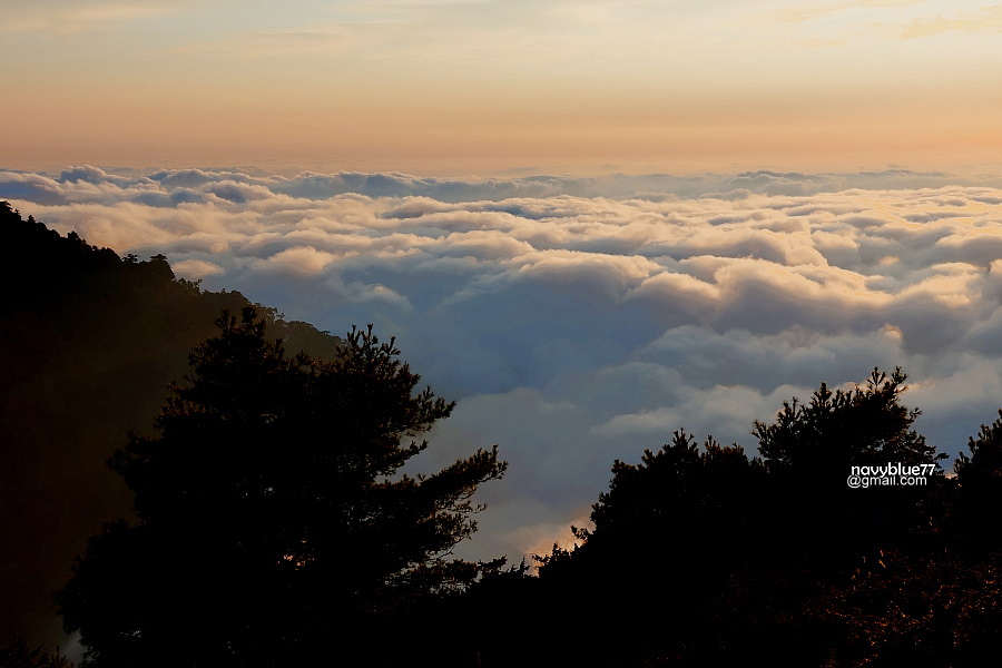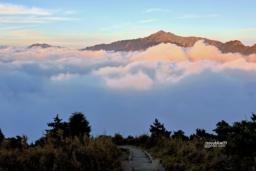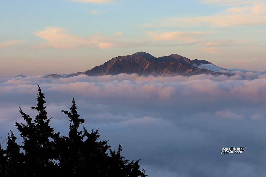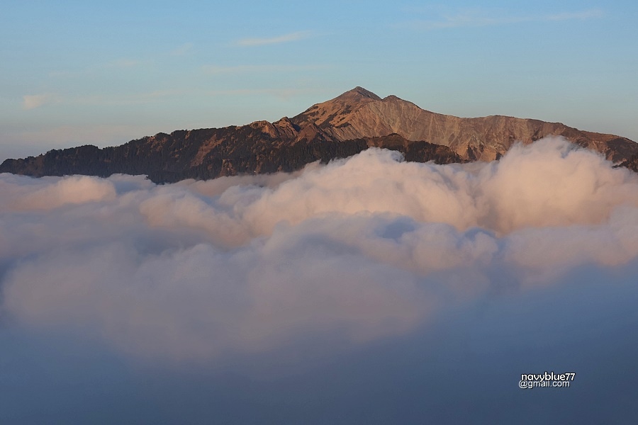 隨著夕陽逐漸西沉,天空的顏色也渲染上淡橘粉橙,布魯惦著西天的美景,又回到西向的展望點,幾位住在山屋的山友聽到上方的驚呼,也跑上來目睹這場夕陽與雲海的大秀。浪仍然翻湧著,映上了西天的顏色後更有層次。最後的蛋黃倏地掉入雲海的盡頭,卻又拉了一條引信,讓空中的殘雲幻作一隻鳳凰,浴火後消失在夜空中。