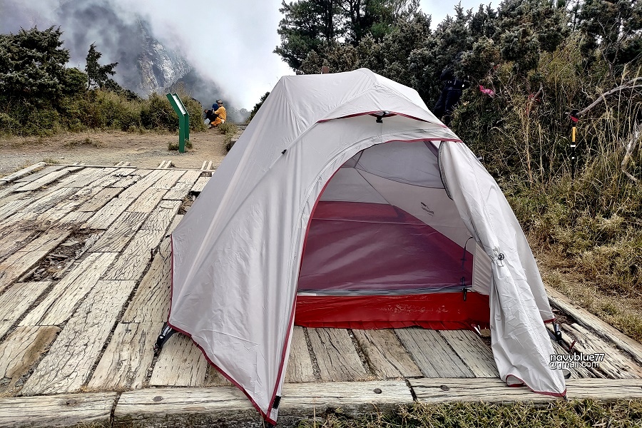 山嵐一陣陣的飄來,像極了撕了一簇簇的蓬鬆棉花,放手讓風吹起輕柔的飄浮。但不到4點老天爺乾脆把整艘貨輪的棉花倒蓋在營地上,忽然間整個天空一片白,布魯心想,第一天的景大概就此被霧嵐沒收了。
