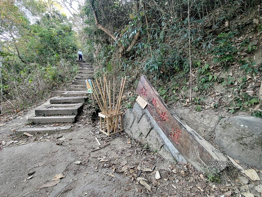 由天艷宮走一小段路至此正式進入鈺鼎步道。步道口有林務局嘉義林管處提供的竹杖登山杖。