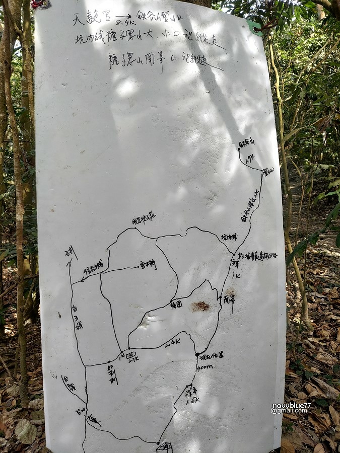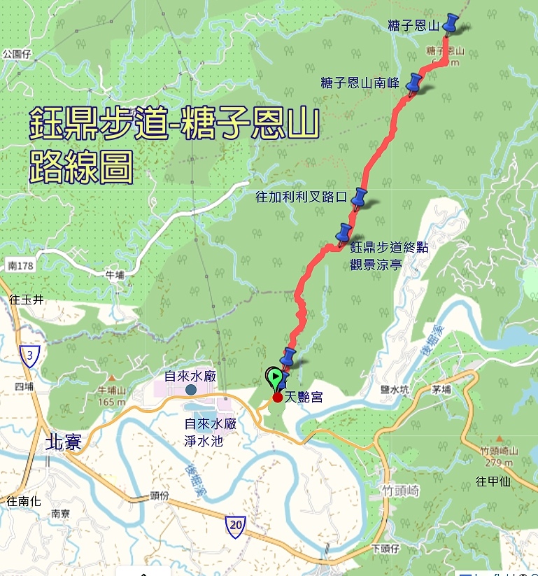 布魯便利貼 路線資訊:天艷宮-(1小時)-鈺鼎步道終點觀景涼亭-(50分)-糖子恩山南峰-(10分)-糖子恩山。以上為純步程時間,回程酌減。含休息輕鬆走,可安排5小時行程。 山岳資訊: 交通資訊: 補給等資訊:北寮村落內有便利商店。天艷宮有洗手間。 |