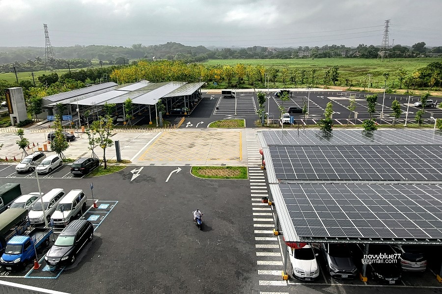 停車場可停兩百多輛小車,部分利用太陽能板做成遮陽棚,夏天很搶手。