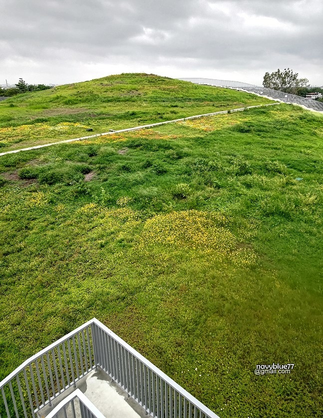 整個困菜市場其實是一座山丘,底下就是市場,兼具綠化及降溫功能。由R樓的觀景台向外望去,就是果菜市場屋頂的山丘。