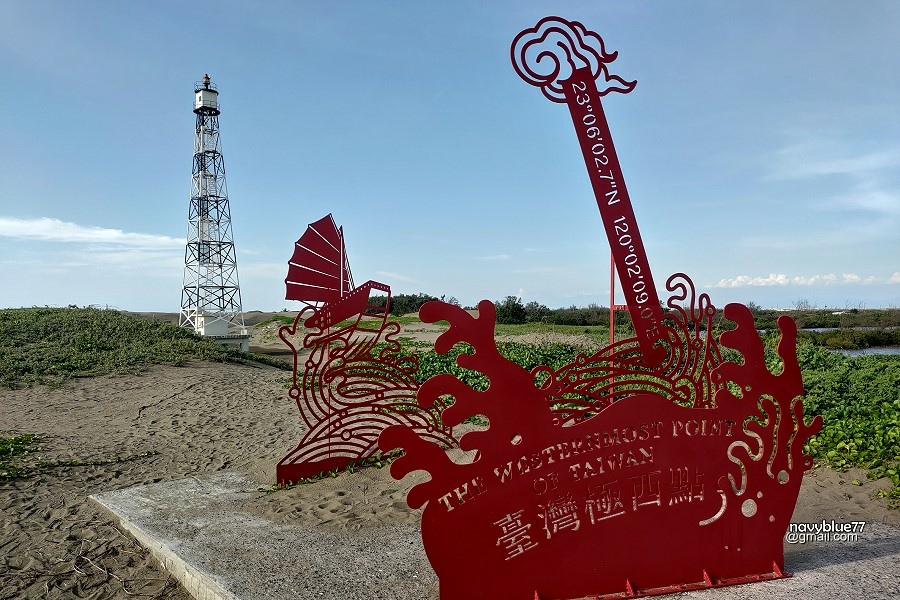 國聖港燈塔: 位置:臺南市七股區頂額沙洲 始建年代:1957年 燈塔諸元:塔高32.7M/ 燈高34.2M/ 光程16. 6浬 特色:四方形鐵造黑白相間塔身。全台極西端燈塔 收費:免費參觀 開放時間:24小時