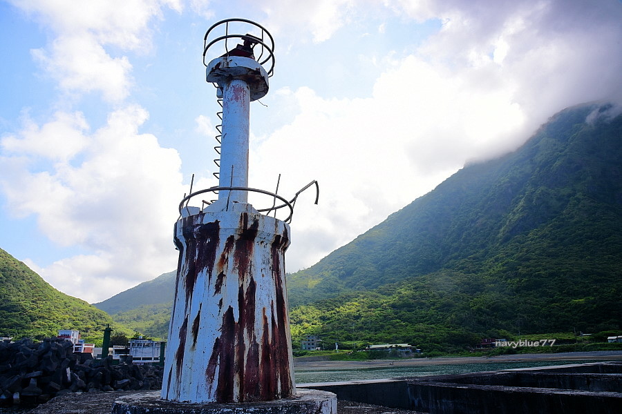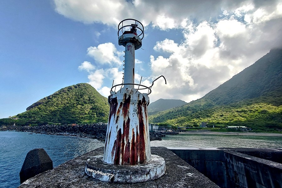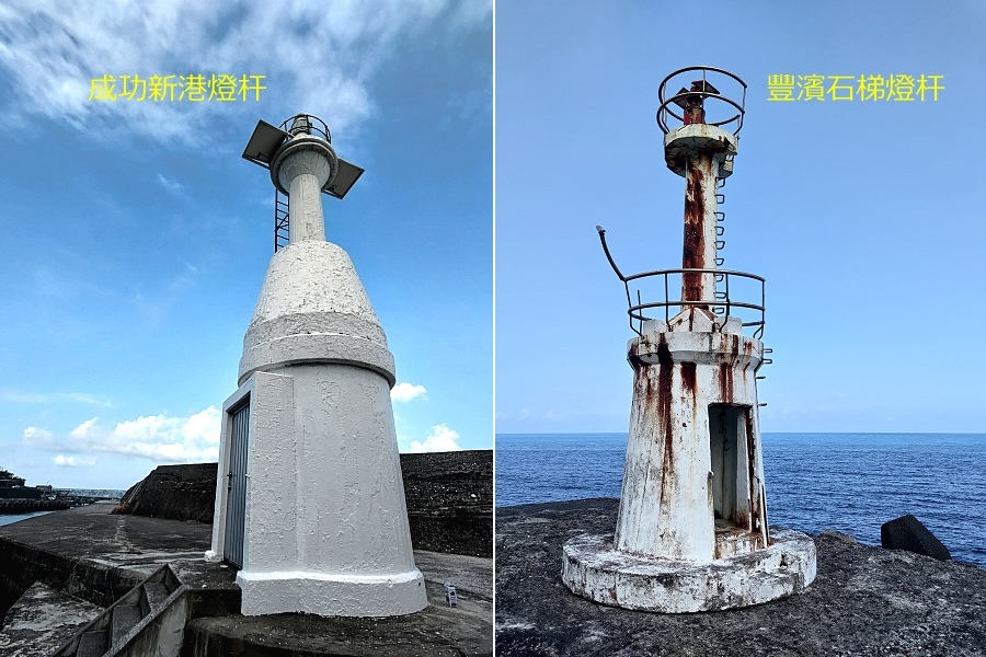 對照一下石梯燈杆和成功新港燈杆,由燈杆上方的結構看起來,石梯燈杆應該是和新港燈杆同樣要裝上導引燈,但顯然導引燈已經拆掉,改裝標示燈。兩支燈杆造型相似,但一支潔白如新,一支斑駁鏽蝕,燈杆的爸爸是誰,結果真的差很大。