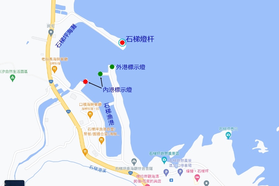 石梯燈杆和漁港的位置圖,石梯漁港共有4支燈杆,其中最早的是石梯燈杆,後來隨著漁港整建,多了3支標示燈杆。