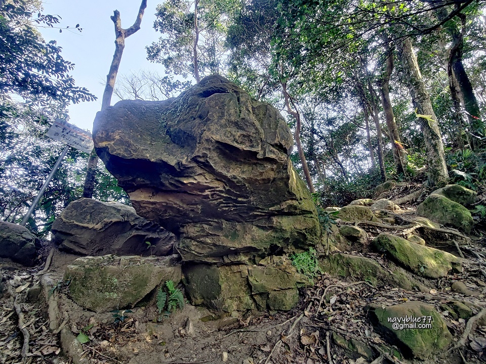 由此巨石處攻上稜線,這顆巨石乍看很像從地底冒出來的暴龍頭。