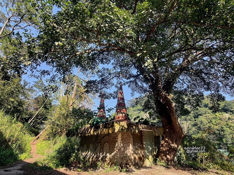 至石門水庫南岸邊有一座可愛造型的廢棄廁所,是早期童話世界遊樂區所建。