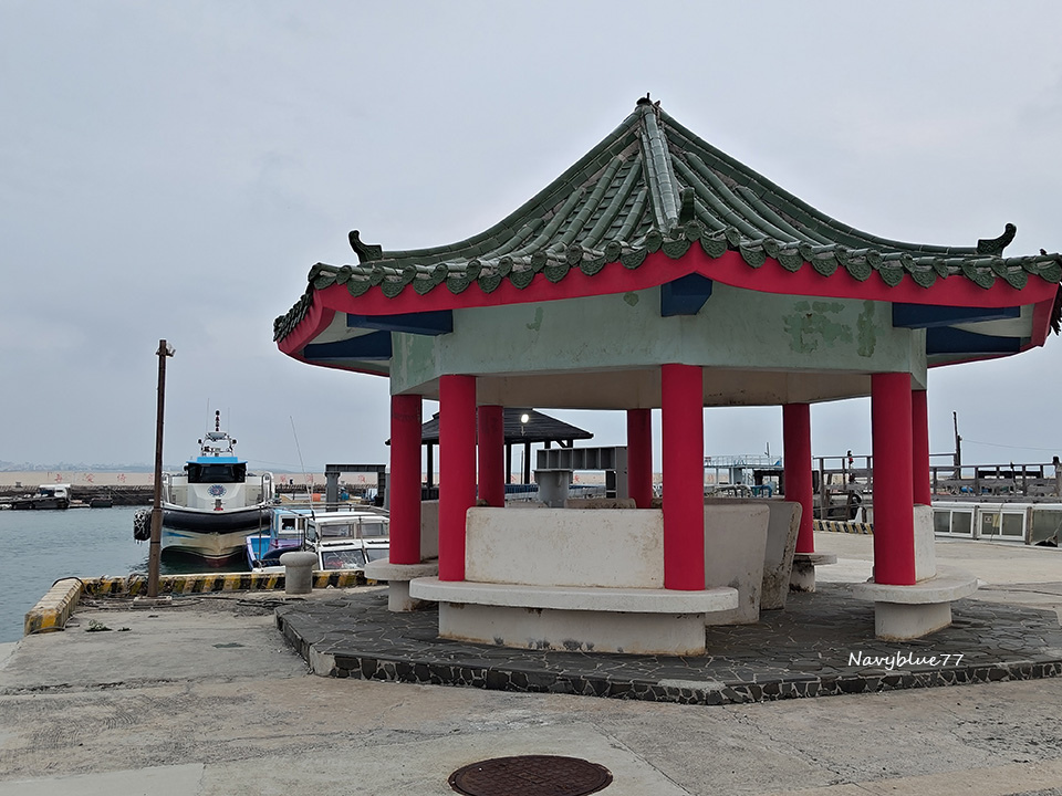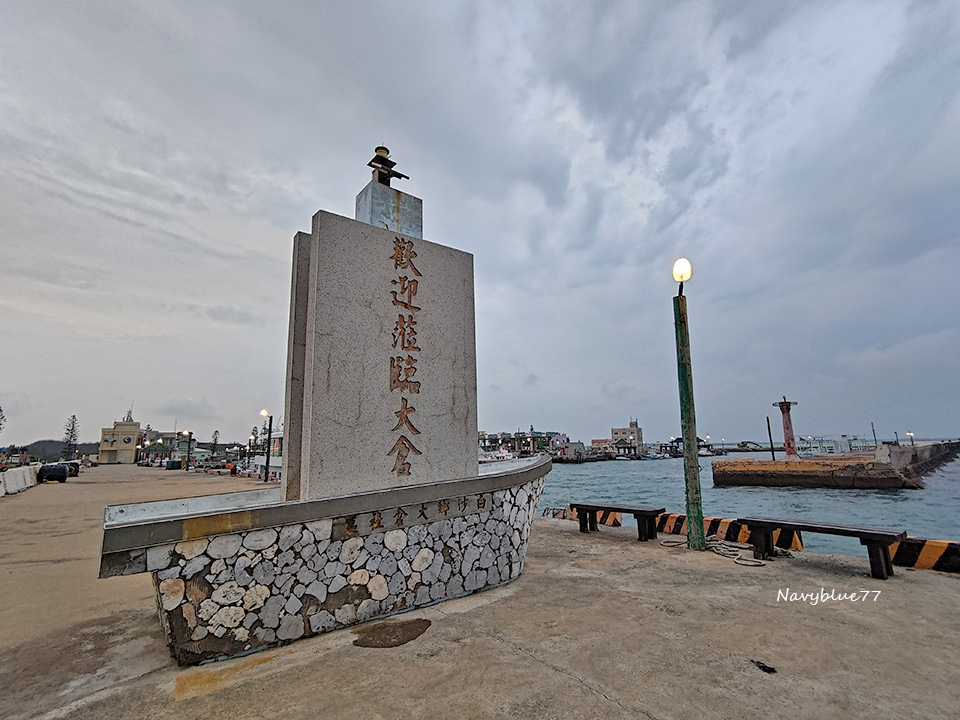 交通船駛入大倉漁港,港門兩支燈杆都有特色。