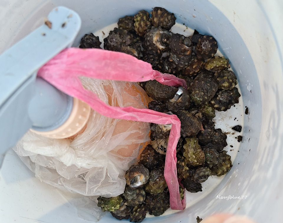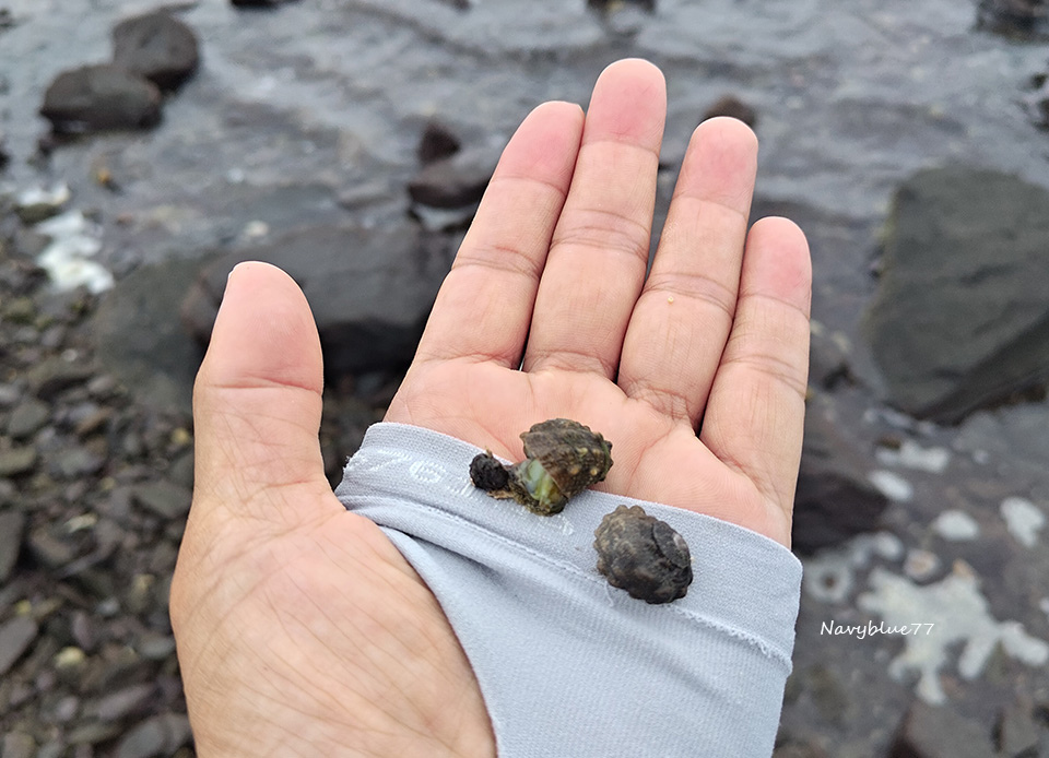 阿嬤說她撿的珠螺會拿去賣給海產店,一斤收購價70元,海產店賣出去可以到賣到一百多元。布魯看看還有時間,便幫忙撿了一些送給阿嬤。