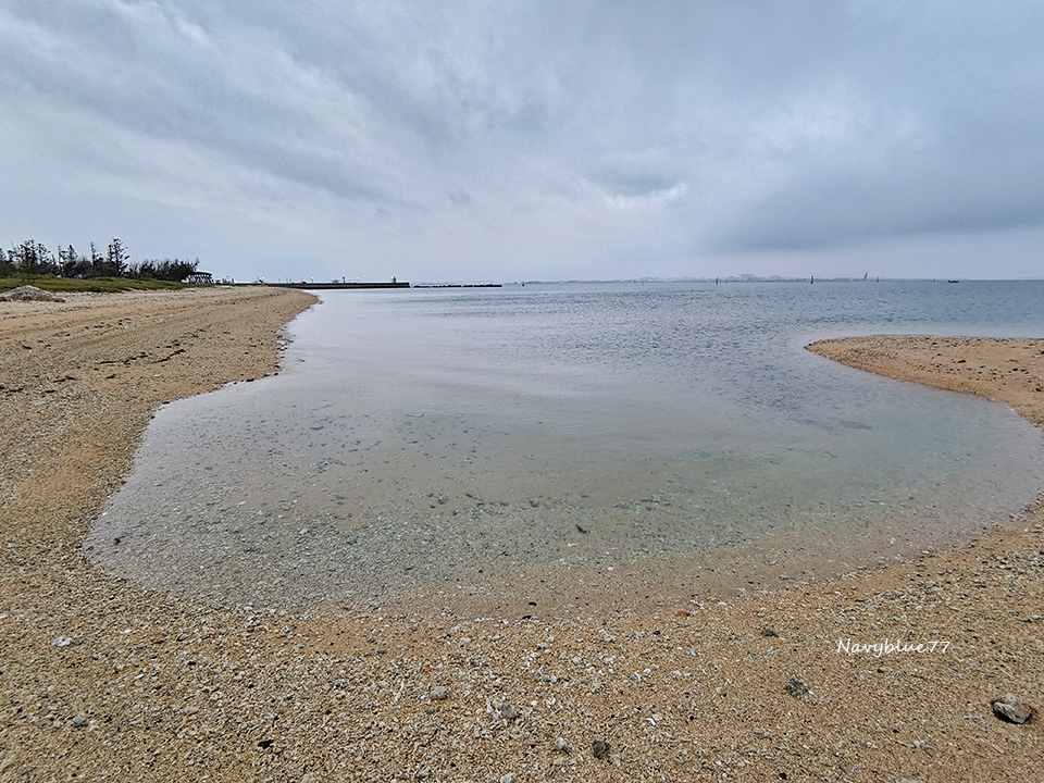 海灘末端有一片沙洲突出海上,將海水圍成清清淺淺的小海灣。